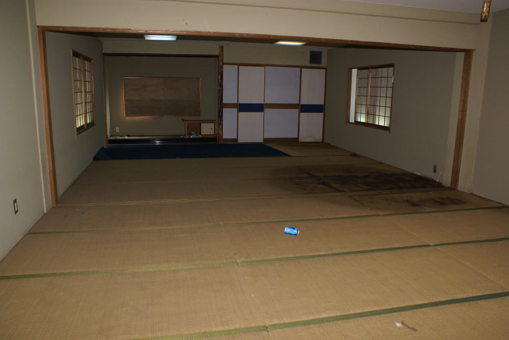 2階和室の続き 同じ部屋の続きと思われる写真 両側に窓が見えるが、構造上両方とも外が見える窓とは考えにくく どちらか片側が前述の植木があったところに出る窓と思われる。 ここにも大胆な雨漏り跡が見られる。